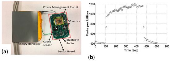 (a) Assembled harvester from Figure 1 sensor board showing ozone and carbon monoxide sensors and a Bluetooth radio antenna; (b) Measured ozone concentration from the sensor board.