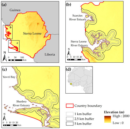 Location of the study area showing: (a) Regional topography with focus areas in northern Sierra Leone and Southern Sierra Leone defined by rectangles; (b) Focus areas in northern Sierra Leone (Scarcies River Estuary and Sierra Leone River Estuary) with multiple buffers extending inland from the estuary boundary; (c) Focus areas in southern Sierra Leone (Yawri Bay and Sherbro River Estuary) with multiple buffers extending inland from the estuary boundary; (d) Location of Sierra Leone in West Africa.