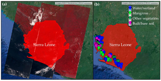 Maps from Google Earth Engine (GEE) showing: (a) Landsat footprints covering Sierra Leone; and (b) location of validation points used for accuracy assessment for the 2016 classified map.