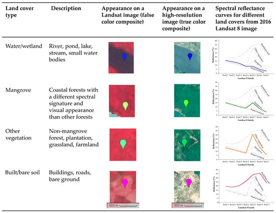 Description of the land cover classes, their appearances on Landsat and high-resolution images, and spectral reflectance curves for representative pixels from each class.