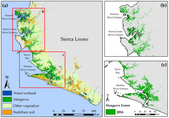 (a) Spatial distribution of the four land cover classes across the Sierra Leone coastal landscape complex for 2016. Panels show mangrove extents in (b) northern Sierra Leone (Scarcies River Estuary and Sierra Leone River Estuary) and (c) southern Sierra Leone (Yawri Bay and Sherbro River Estuary).