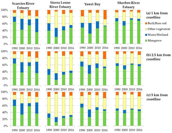 Figure 5 further summarizes the spatiotemporal changes of the different land cover classes between different time slices. In the Scarcies region, mangroves remained the most dominant land cover (Figure 5). However, the Scarcies witnessed fluctuations in mangrove extents with more mangroves during 1990 (66% within 1 km, 65% within 2.5 km, 59% within 5 km) and 2010 (56% within 1 km, 57% within 2.5 km, 58% within 5 km). Mangrove extents declined in this region during 2000 (43% within 1 km, 38% within 2.5 km, 34% within 5 km) and 2016 (36% both within 1 km and 2.5 km, 37% within 5 km), mostly owing to an increase in water/wetland (Figure 5). Built area/bare soil more than doubled during post-2000 years, increasing from 8% to 18% both within 1 km and 2.5 km, and from 6% to 14% within 5 km.