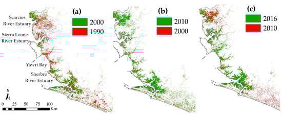 Decadal changes in mangrove extents in the Sierra Leone coastal landscape complex (SLCLC) during (a) 1990–2000, (b) 2000–2010, (c) 2010–2016.