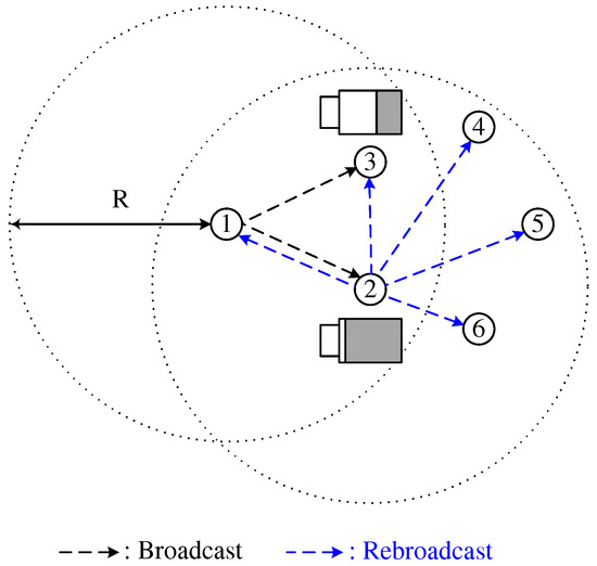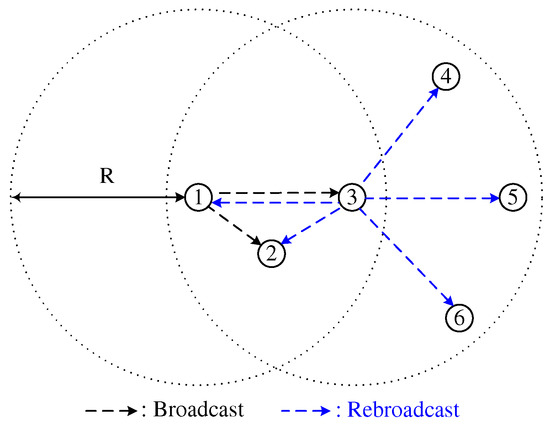To mitigate the broadcast-storm problem, counter-based broadcast schemes have been proposed. In counter-based broadcast schemes, a node receiving a broadcast-message sets the count value (c) and random access delay () to keep track of the number of duplicate broadcast-messages received. Next, the node counts the number of duplicate broadcast-messages received during . As soon as the timer expires, the node compares the count value with a fixed count threshold value (). If , the node transmits the broadcast-message; otherwise, transmission of the broadcast-message is inhibited. Thus, the counter-based broadcast scheme can mitigate the problems of collision and redundancy in broadcast-message retransmissions in blind flooding [7,8]. The performance of the counter-based broadcast scheme is greatly affected by the count threshold value and random access delay. For example, when the count threshold value is set too low or a too short random access delay is used, the possibility that a node relays broadcast-messages decreases. Then, the propagation of the broadcast-message is limited, and, therefore, the reachability deteriorates. Nevertheless, in this case, the redundancy in the retransmission of the broadcast-message and the energy consumption of the nodes decrease, owing to the small number of the retransmissions of the broadcast-message. It means that the use of and in counter-based broadcast schemes involves a trade-off in a sense that the use of a short and small results in low reachability, reduced redundancy in the retransmission of broadcast-messages, and high energy efficiencies for the nodes in the network. Node density is another important factor that affects the performance of the counter-based broadcasting schemes. For a given and , nodes in dense areas have higher probabilities of transmitting the broadcast-messages than those in sparse areas. Therefore, high reachability is achieved and the energy efficiency is improved; however, the redundancy via the retransmission of broadcast-messages increases when the node density is high. Thus, an efficient counter-based broadcast scheme should dynamically adjust the random access delay and count threshold value to ensure high reachability, low number of redundant retransmissions of broadcast-messages, and high energy efficiency of nodes, according to the variations in the node density.