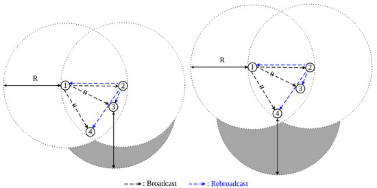 In Figure 4, nodes 3 and 4 are equidistant from node 1 and receive the same broadcast-messages from both nodes 1 and 2. Here, it is noticed that, although nodes 3 and 4 are equally far from node 1, the additional coverage of node 4 is wider than that of node 3 because of the geographical locations of the nodes. This explains the necessity to calculate the exact additional coverage areas of the nodes that receive the same broadcast-message from two different nodes, so that nodes with the largest additional coverage areas are more likely to be selected for rebroadcasting the packets, thereby achieving high reachability.