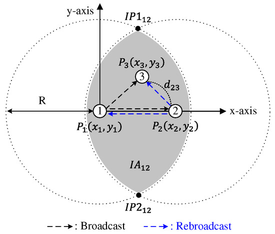 Suppose that node 1 sends a broadcast-message and node 2 rebroadcasts this message. Then, node 3 in the intersection area of the coverage areas of nodes 1 and 2 (shadowed area in Figure 5) receives the same broadcast-message from both nodes 1 and 2. It is assumed that each node is equipped with a GPS, and, thus, the distance between two nodes is recognized by the receiving node via the broadcast-message containing the GPS information of the sender [13]. Let R and be the transmission range of a node and the distance between nodes i and j, respectively. Because node 3 receives the broadcast-messages delivered through node 1 and node 2, it can recognize the distances , and . Let the point of node i in the two-dimensional Euclidean space be and the coordinates of the node i be (, ). Without loss of generality, we assume that node 1 is located at the origin point and that node 2 is on the right-hand side of the x-axis, as shown in Figure 5. That is,