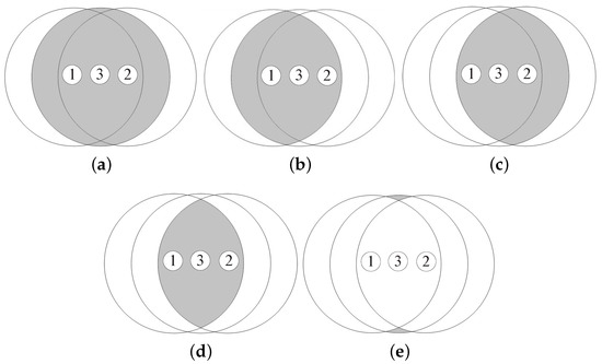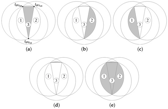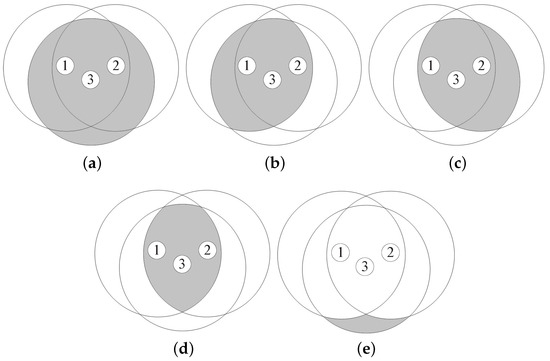 An intersection area within the transmission range of three nodes. (a) ; (b) ; (c) ; (d) ; (e) .