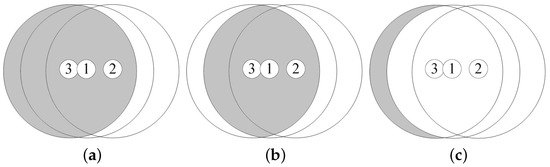 The additional coverage area of node 3 in case 2. (a) ; (b) ; (c) .