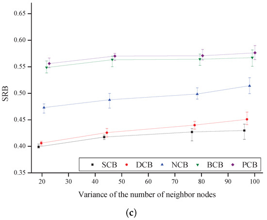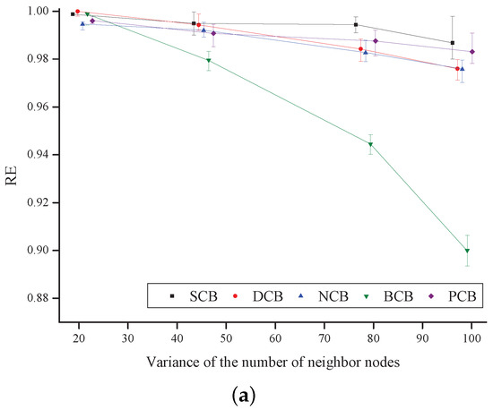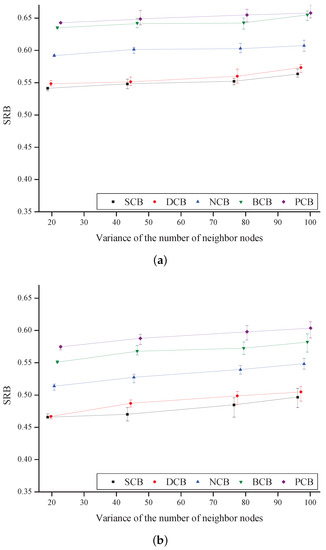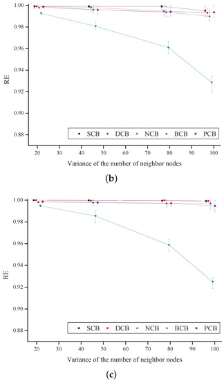Figure 12 shows the as a function of the variance in the number of neighbor nodes and of the count threshold value. For SCB, DCB, and NCB, is used as the count threshold value. In BCB and the proposed counter-based broadcast scheme, an adaptive count threshold is used, as shown in Equations (3) and (37). Generally, increases as the variance of the number of neighbor nodes increases in all the schemes because increases in high-node-density areas. We confirm that the proposed scheme outperforms the other four existing counter-based broadcast schemes in terms of . This is because, under the proposed scheme, a node close to the broadcasting node or a node that cannot achieve a wider additional coverage area is more unlikely to retransmit the broadcast-message in a high-node-density region.