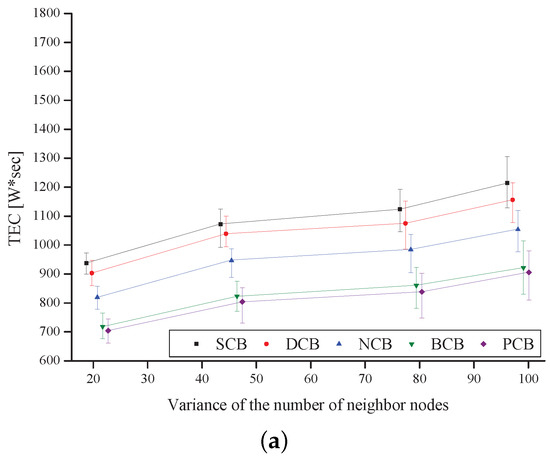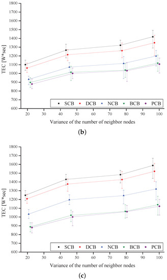 Figure 14 shows as a function of the variance of the number of neighbor nodes. The result shows that increases as increases, for all the schemes. In addition, decreases as the variance increases in all of the schemes because the power consumptions of the nodes located in high-node-density regions decrease. It is noticed that the proposed scheme outperforms the other four existing counter-based broadcast schemes in terms of the TEC because a node that has a high remaining amount of battery retransmits the broadcast-message, under the proposed scheme.