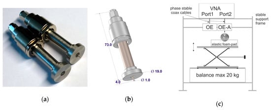 Two kinds of probes were used in this work: a coax OE probe and a coax OE-A (Figure 1a left and right, respectively). They were machined from the stainless steel. The dimensions (Figure 1b) were adjusted to have a 50 Ω impedance line between the SMA connector Pasternack PE4403 (Pasternack Enterprises, Inc., Irvine, CA, USA) and the ending fixed in a bead made of epoxy-resin. The dielectric constant of the epoxy resin was 3.8 ± 0.1 and was measured by the Agilent impedance analyzer E4980A with the 16451B dielectric test fixture.