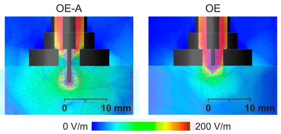 Before measurements, numerical simulations for distilled water were performed using EMPro digital simulation software pack from Keysight (formely Agilent) (Figure 2). The mesh is made automatically by EMPro which chooses the most optimal mesh density, therefore, the Nyquist criterion was fulfilled. Absorbing boundary conditions were applied in simulations. Simulation results proved that the electrical field penetration depth generated by the applied OE-A probe is bigger than for OE probe (Figure 2). Imaginary part of distilled water electrical permittivity and electrical conductivity are smaller as compared to apples. Therefore, similar simulations were also performed for materials with higher conductivity, up to 0.8 S/m. Obtained results showed that electric field penetration depth was practically the same as presented in Figure 2 for distilled water.