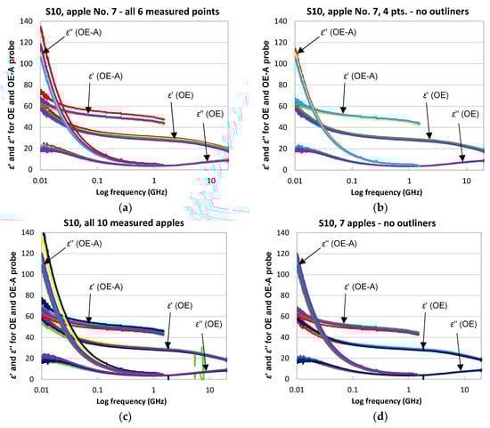 During the measurements the probes were connected to the VNA through phase-stable cables (Anritsu 3671KFKF50-60). Each apple was measured six times with each probe, paying special attention to have no air gap between the probe flat ending and the apple. This was sometimes not possible because of the apple shape. Apple is a solid material with a curved surface and that prevents a good contact of the OE probe []. Therefore, two from six measurements were eliminated automatically as outliners by a dedicated MATLAB procedure. The outliner elimination procedure tested only the real part of the dielectric permittivity at the arbitrary chosen frequency of 100 MHz, where a flat shape of the spectrum begins. Having n curves, the outliner i curve was selected by calculating n standard deviations for the combination of n sets, each without one elementary curve. The minimal standard deviation from the calculated n values, indicated the curve that should be eliminated, leaving n – 1 curves. The procedure was applied again to eliminate another outliner curve. The same procedure of outliers elimination was repeated to reduce the number of apples from 10 to 7 in each series to make the measurement series representative. Each frequency scan included 1998 points in a logarithmic scale from 10 MHz–20 GHz, 600 points per decade. If the frequency was 300 Hz, a single measurement was performed.