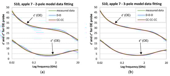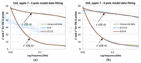 Results of the best and the worst data fitting of dielectric spectra of collected with the OE probe for series S10, apple No. 7 for; (a) two-pole and (b) three-pole models.
