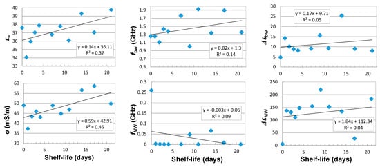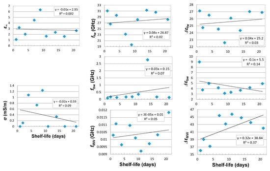 There was no correlation found for the OE probe between the apple shelf-life and the parameters of the multipole model described by Equation (5) with three dispersion effects described by the Cole-Cole model (Figure 6). This is probably due to the presence of apple skin, which masks the apple-flesh properties that are most important for the shelf-life period. This is confirmed by slightly better correlations received for the OE-A probe, in the case of electrical conductivity , bound water relaxation frequency , and high-frequency dielectric parameter (Figure 7). The respective multipole relaxation model included only two dispersion effects (as the result of 1.5 GHz frequency limit for the OE-A probe) caused by the bound water and the interphase polarization (Maxwell-Wagner effects).