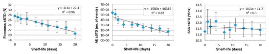 The temporal variability of apple physiochemical parameters in each series is presented in Figure 8. No correlation was found for soluble solids content and the shelf-life, but the apple firmness measured by the puncture and acoustic emission methods showed good correlations ().