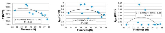 Relation between firmness of the tested apples and selected multipole model parameters (low frequency electrical conductivity σ (mS/m)—left, relaxation frequency of bound water effect bw —middle and relaxation frequency of Maxwell-Wagner effect MW—right) for measured with the OE-A dielectric probe.