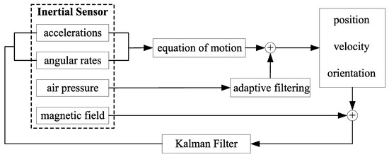 Figure 7 shows the equivalent information extraction of a specific acceleration signal. In this case, a velocity change of the moving object is observed between the time interval from s to s. Hence, the digital inertial data processing eliminates the static as well as dynamic noises caused by the platform vibrations, which finally leads to the specific angular rates and the acceleration measurements at the timestamp k inclusive the corresponding variances. In the next subsection, an alternative adaptive filtering method is introduced to focus on variations in air pressure measurements.