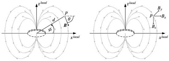 In this work, vectors are designated with bold and matrices are represented with upper case. Figure 2 illustrates the induced magnetic field at the point p. Besides the elevation angle and the slope distance d, the point’s coordinates can be described by triaxial vector components [14]. Therefore, the local magnetic field at point can be expressed by: