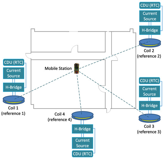 This exemplary platform is employed in MILPS, whereas the mobile station and the reference points are equipped with real-time clocks (see Figure 3). This platform enables the generation of the DC-pulsed magnetic signals in predefined time slots with a period of time set to s.