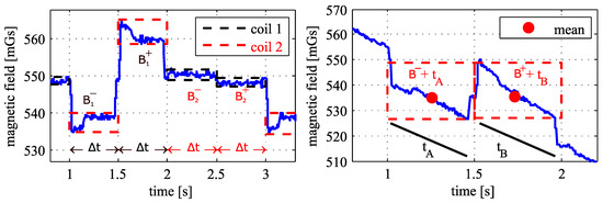 The left chart in Figure 5 shows an extract of the captured magnetic field intensity in the local x-direction from a static sensor with respect to two reference points. The signal polarity as well as intensity depends on the configuration between the object (sensor) and the corresponding coil. The local magnetic field components and describe the coil’s signal in positive and negative current directions, respectively. Assuming that low frequency interferences do not change during the switching interval , a coil’s specific magnetic field can be calculated by taking the difference between the corresponding negative and positive signal sections. Therefore, the arithmetic means of two subsequent clusters (a cluster describes the measured signal during the time leads to elimination of high frequencies. The specific signal intensity of the coil is calculated as follows [5]: