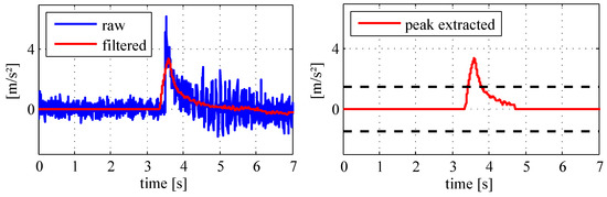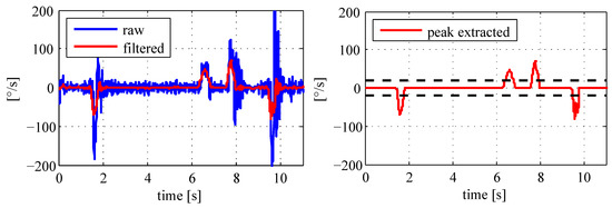Figure 6 shows the proceeding of a filtering example using angular rate measures. A smoothed time series are observed, which are subject to an information extraction to obtain true motion changes. The peak detection in the signal time domain is applied utilizing predefined thresholds. The sample in Figure 6 is based on obvious direction changes during four explicit time intervals. Empirical values are thereby applied to extract all significant signal peaks, whereas other values are set to zero (see the right chart in Figure 6).