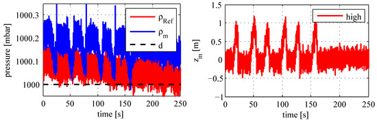 Figure 9 shows captured pressure progressions (left chart) as well as the constant desired signal (right chart), which delivers the calculated z-coordinate as part of the system state. In contrast to the barometric high determination, the object’s entire state vector is computed by considering all processed inertial signals. However, this requires a transformation from the sensor’s coordinate system to the local frame with respect to the current orientation. Therefore, an overview about system transitions with sequential rotations is given in the next Section 4. This transformation is a relative state estimation as part of the positioning algorithm.