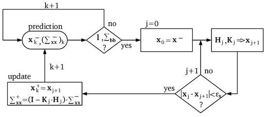 The MILPS is deployed to compensate the instabilities of the dead reckoning system, whereby an IMU/magnetometer sensor fusion is used to support the system state as well as its variance-covariance matrix . The method of Kalman filter is applied to update the predictions, if observations of the MILPS are available. An iterative executed modification is thereby carried out for reaching unbiased state estimations due to the arising of nonlinearities while using the observation equations [28]. Regarding Equations (5)–(7), the Iterated Kalman Filter (IKF) consists of the following observation model:
