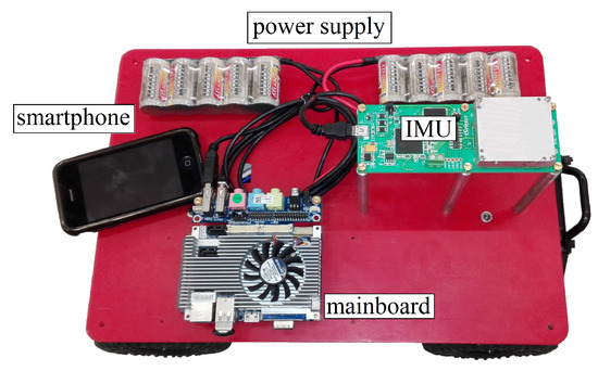 The deployed vehicle, which is composed of a DC powered electric motor, can reach a maximum velocity of up to 3 m/s. It has a platform area of 0.3 × 0.4 m that enables mounting the Adis 16480 IMU as well as a mainboard for the data logging (see Figure 11). Information about the reached tracking accuracy is delivered by an iPhone 3 GS camera mounted at the object’s back site.