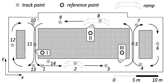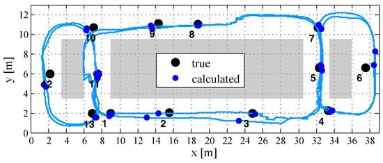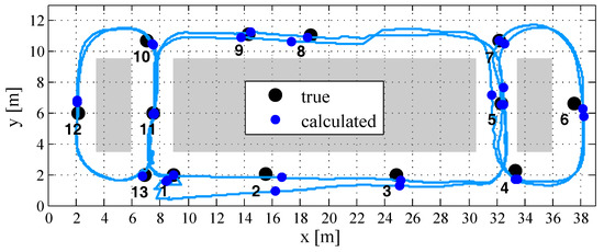 Additionally, an equivalent reference IMU is placed in a known height at the point 14 for observing the local ambient atmospheric pressure. All sensor data has been recorded in real time in the platform’s mainboard for a post-processing in MATLAB [29] to evaluate the implemented algorithm. The IMU sampling rate is set to 200 Hz and the activation time of the coils is 0.3 s. This ensures reaching high frequency inertial information as well as temporary magnetic field data, if the mobile platform is within the reach of the coils, which are placed at the height of one meter. The smartphone camera provides video sequences with a repetition rate of about 30 fps (frames per second), which enables a tracking acquisition of the passing points up to a resolution of 0.03 s. The common time stamp allows true-calculated comparisons of the corresponding track points at discrete locations. The IMU/smartphone synchronization is thereby carried out by matching significant movements in the video frames with the corresponding peaks of the acceleration signals. Furthermore, the camera recognizes the marked tracking points as true positions.