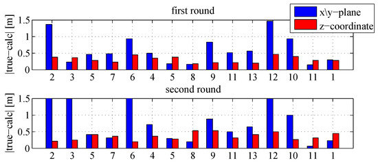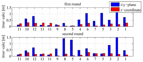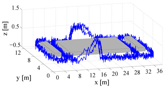 To demonstrate the repeatability of the results, a second test drive has been carried out by passing through the return path, which is illustrated in Figure 15. This second measurement confirms the results of the first tracking test drive. The calculated trajectory differs from the true track in a range of about 1–1.5 m at the well-known track points (see Figure 16). The height-computations, which also confirm the results of the first test, have an accuracy of under m. The results manifest that the developed tracking algorithm, which fuses inertial data with artificially generated magnetic fields, is feasible for localization in NLoS scenarios. The only use of inertial sensors suffers from position drifts in the range of a few meters after a short period. In contrast, the developed IMU/MILPS fusion enables solutions with accuracies of less than one meter in practical implementations. Figure 17 illustrates the three-dimensional presentation of the calculated tracking paths.