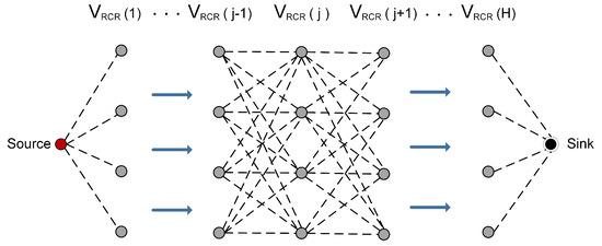 Let denote the set of cooperative nodes (i.e., RCR) at the j-th hop; let denote the adjacent cooperative group of a hop closer to the sink. Let and denote the reference nodes of and , respectively. According to Definition 1, for given , and , , and for and , we get .