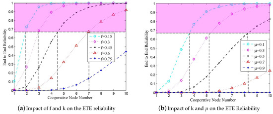 In order to verify the impact of k and f on W in Formula (7), we used MATLAB to perform the simulation, wherein we varied k from 1 to 10, while changing f from 0.15 to 0.75 with the step of 0.15, and was fixed to zero. In order to keep consistent with the simulation scenario, the hop count is set to 14. As shown in Figure 3a, the lower f is, the larger k and W are. In order to increase the reliability of packets, the FECcoding was used. After FEC package-level encoding, 67% successful FEC packet delivery can guarantee the recovery of original packets. Thus, based on the results presented in Figure 3a, the minimal k can be determined for certain f. According to the results presented in Figure 3a, where the shadow area represents the ETE reliability, which is larger than 67%, if f is equal to 0.3, k should be set to three, and if f is equal to 0.45, then the minimal k increases to five.