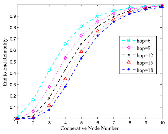 Then, the successful delivery ratio at hop j is represented by , and it is defined by Formula (5), where represents that all nodes are sleeping when transmission has failed; represents that only one node is awake; however, the node fails its transmission; represents that two nodes are awake among RCR; however, both of the nodes fail in their transmissions, and so on. Similarly, represents that all cooperative nodes are awake, but all their transmissions have failed.