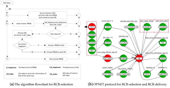 The algorithm flowchart of RCR-selection is shown in Figure 5a, and the OPNET protocol for RCR-selection and RCR-delivery is shown in Figure 5b. Specifically, the pseudocode of the RCR scheme is presented in Algorithm 1.