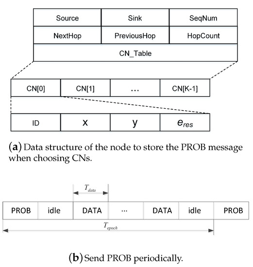 Figure 6a shows the data structure of the node to store the PROB message when choose CNs. The field named “CN_Table” is an array where the PROB information of which node received is stored, and each CN includes node ID, coordinates and node residual energy .