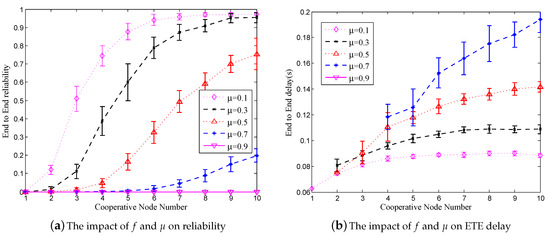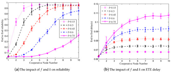 In the simulation whose results are presented in this section, f was fixed to 0.3 and k varied from one to 10. Figure 8a shows the impact of f and on reliability under the variations of from 0.1 to 0.9 with a step of 0.2. The simulation results are compatible with the theoretical results shown in Figure 3b. Moreover, the simulation results presented in Figure 8b show that the larger is, the longer the ETE delay is. Once is fixed, with the increase of k, the ETE delay converges to a certain value.