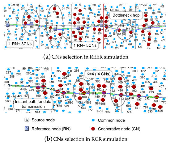 Figure 10 shows the snapshots of OPNET simulations for the same network scenario for the REER and RCR protocols. The number of cooperative nodes (packet forwarders) in hops in REER was unstable, as shown in Figure 10a. For instance, some hops had six cooperative packet forwarders, which included one reference node and five cooperative nodes, while the bottleneck hop only had three cooperative packet forwards, which was because the uneven node distribution in the fixed CN selection region for a given predetermined causes an unbalanced number of CNs at every hop. In contrast, with the same average number of CNs, RCR produced the same number of CNs at each hop with the dynamic node distribution. Since the hop distance in RCR is adaptive to the QoS requirement for reliability, there were four CNs at each hop, as shown in Figure 10b.