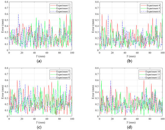 The lines in black indicate the detection results of the borders between the bead and the groove sidewall, and the lines in red indicate the detection results of the borders between adjacent passes. Although there are five visible passes in both sample A and sample B, the passes are in different layers. The 3D reconstruction results show that these passes in different layers can be successfully distinguished. Another twenty experiments are carried out to verify the applicability of the proposed method using the same types of samples. The minimum protrusion of the bead surface in the samples is not more than 0.3 mm. We define the detection errors to be the 3D distances between the detected weld border points and the actual weld border points (the 2D positions of the actual weld border points are manually marked in the images, so that their 3D positions can be calculated by the triangulation methods using the structured light images). The detection errors of these twenty experiments are shown in Figure 29, in which Y means the length along the welding direction. The detection error distributions of these experiments are shown in Figure 30. Figure 29 and Figure 30 show that the maximum detection error does not exceed 0.6 mm in these experiments.
