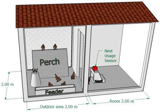 The developed “nest-usage-sensor” was set-up and tested through an experimental nesting system installed in an experimental housing system. This housing system was a free-range system composed by a covered outdoor area of 4.0 m2 (2.0 × 2.0 m) and a room with the same dimensions (Figure 1). A water dispenser, a feeder, and a perch was provided to hens in the outdoor area, while the experimental nesting system was positioned in the room, close to the room entrance, as shown in Figure 1.