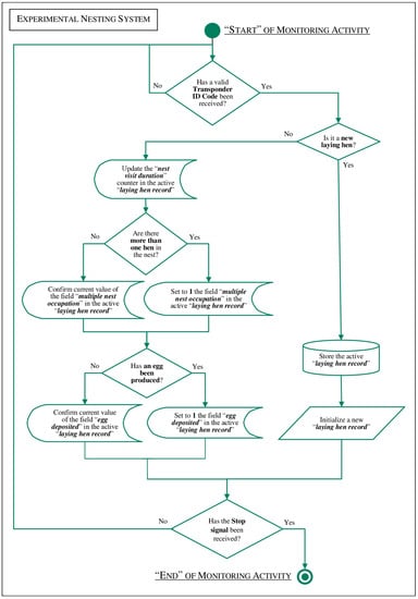 Hardware components used in the experimental nesting system were controlled by dedicated software application developed with LabVIEW (National Instruments, Austin, TX, USA–version 8.5). The tasks performed by the software application are described in the flow diagram reported in Figure 2. As it is shown, when a new hen is identified by its transponder a new “laying hen record” is created []. If the hen stays in the nest, its transponder is repetitively read by the RFID system and the record field “nest visit duration” is continuously updated. When a multiple nest occupation is detected by the “nest-usage-sensor”, the record field “multiple nest occupation” is set-up. If an egg is laid and detected by the couple of photo cells during its fall in the collection tube, the record fields, called “egg deposited” and “deposition time”, are set-up. Finally, if the hen stays in the nest for more time after to have laid an egg, the record field “nest visit duration” continues to be updated. Only when a new hen is identified through its transponder, the current “laying hen record” is stored (by a log text file) and a new one is initialized [] with all of its record fields reset to zero. Of course, all values recorded during a monitoring session are shown to users by a dedicated graphical user interface.