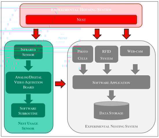 Functional schema of the hardware and software components of the “nest usage sensor” with their connections to the other main components of the experimental nesting system.