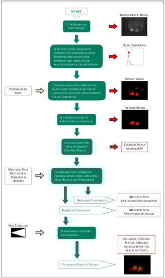 The “nest usage sensor” was basically a machine vision system composed by: a thermo-camera for the acquisition of thermografic images; an AD video conversion board; and, a dedicated software subroutine for the automatic elaboration of images acquired. The functional schema of these hardware and software components is provided in Figure 3.