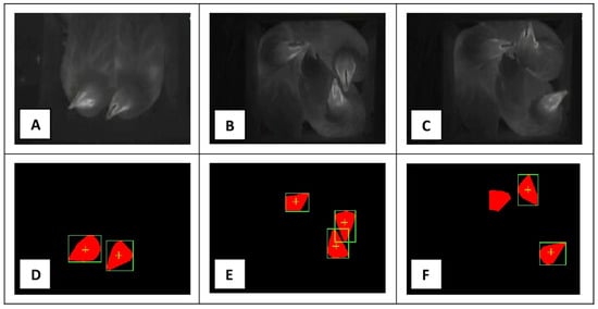The pictures (A–C) are thermografic images acquired by the “nest-usage-sensor” from the nest interior; The pictures (D–F) are the results of the image pattern recognition procedures performed by the sensor having as input the images (A–C); Picture (D) is an example of a true-positive case considering the detection of a multiple or double nest occupation and, in the same time, an example of a true-negative case if the detection of a triple nest occupation is evaluated; Picture (E) is an example of a true-positive case, when considering the detection of a multiple or triple nest occupation, and an example of a true-negative case for the detection of a double nest occupation; Finally, picture (F) is an example of a true-positive case about the detection of a multiple nest occupation; of a false-positive case for the detection of a double nest occupation and of a false-negative case if the detection of a triple nest occupation is taken into consideration.