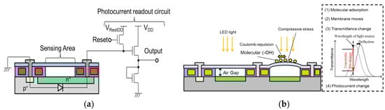 The authors have previously reported a method to fabricate an optical-interference-type surface stress sensor for improving the signal conversion efficiency of the surface stress sensor []. Compared to the conventional MEMS chemical sensor, our sensor improved the signal conversion efficiency by utilizing an exponential change of optical interference characteristics and showed analytical improvement by two orders of magnitude. In addition, since the MEMS light interference type sensor has a feature in the structure and the sensor section is a photodiode, this sensor can be integrated with a complementary metal oxide semiconductor (CMOS) image sensor. The Fabry–Perot optical interference surface stress sensor can expand to the voltage output of the sensor response with only the buffer amplifier, and it can be extended for the multiple detection and imaging of biomolecules to measure gas distribution by using CMOS image sensor technologies.