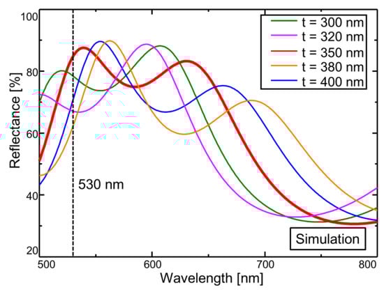 Reflectance spectrum of the Fabry–Perot interferometer for different thicknesses of the parylene-C film. The optical multilayer films are designed to use a 350-nm-thick parylene-C film and 400-nm-thick silicon-dioxide film with an air gap of 300 nm.