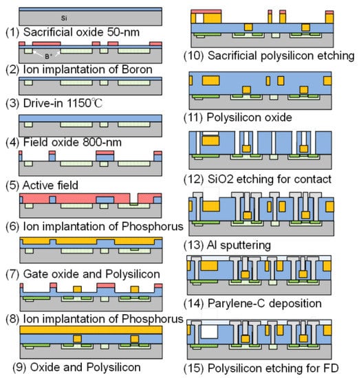 The fabrication process overviews of the Fabry–Perot optical interference surface stress sensor are shown in Figure 4. In this process, a 4-inch P-type silicon substrate was used. A sensor is fabricated as shown in the process flow. First, a dry oxide film was formed as a protective film for ion implantation. Next, threshold adjustment of the substrate was performed by ion implantation (B+), as well as lithography of the diffusion region. A polycrystalline silicon layer with a thickness of 5000 Å was deposited by low-pressure chemical vapor deposition (LP-CVD), and a gate electrode of the transistor was formed. Then phosphorus ions were implanted into the N layer of the photodiode, the source-drain region of the MOS transistor, and polysilicon. Polysilicon was deposited again and etched with xenon difluoride gas to create the hollow structure of the sensor. Subsequently, the surface of the sacrificial layer was oxidized. The air gap was set to 300 nm in consideration of the selectivity ratio of sacrificial layer etching, under the same condition as the polysilicon of the gate. A thermal oxide film was used as a passivation layer of the photodiode and an interlayer insulation film of the MOS because tetraethyl orthosilicate (TEOS) has a low etching selectivity for xenon difluoride; TEOS has been generally used for interlayer insulation for standard very large scale integration (VLSI) circuits. On the other hand, no influence of electrical properties of the MOS transistor insulated with thermal oxide was expected. In this paper, we propose an MOS transistor process that does not use TEOS, considering that the selection ratio of xenon difluoride gas decreases in TEOS during sacrificial layer etching. Thereafter, the oxide film on the sensor surface and the contact portion is removed, and Al–Si aluminum wiring is performed. After silane coupling treatment, parylene-C is deposited. Parylene-C is released after an etching hole is formed.