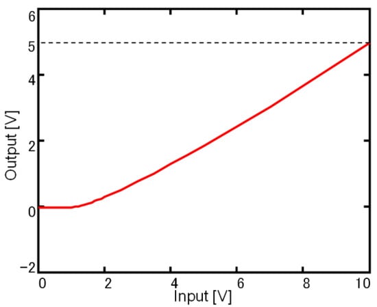 Figure 5 shows the basic characteristics of a negative-channel metal oxide semiconductor (NMOS) source follower circuit fabricated by a process that does not use TEOS. The driving voltage is a DC voltage of 5 V, and the applied gate voltage is a linear voltage of 0 to 10 V. We confirmed the operation as a source follower circuit and demonstrated the CMOS-first-MEMS-last integration process by adapting the thermal-oxide passivation for the MOS transistors and the photodetector of the MEMS sensor.