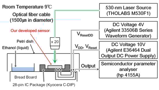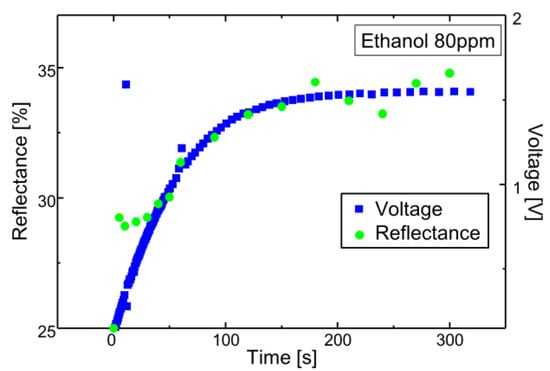 In this paper, a change of the light reflection spectrum of the sensor and the light signal received by the sensor section were reflected as a change in the current-voltage characteristics of the signal processing circuit, and the voltage-time change was measured using ethanol. The experiments were conducted at one concentration, and it was confirmed whether membrane deformation due to gas-molecule adsorption could be transduced. The reflectance of the sensing area was measured using a spectrometer (USB2000 Ocean Optics, Tokyo, Japan) with a white light source. The reflected light was collected by a microscopic objective lens and coupled into a fiber. The experimental set-up is shown in Figure 6. An LED light source (Thorlabs M530F1, Tokyo, Japan) with a wavelength of 530 nm and a power of 91 µW was used as the laser light source. First, a change in the light reflection spectrum was observed in a state where a sensor, before the vapor deposition of amino-methyl functionalized poly(para-xylylene) (diX-AM) on a movable film, was placed in an ethanol atmosphere for 90 s. It was confirmed that no change occurred in the movable film before the diX-AM film was deposited, as shown in Figure 7a. Figure 7b shows the change in the light reflection spectrum when a diX-AM film (thickness of approximately 10 nm to 20 nm) was evaporated on the same sensor and the chip was placed in an ethanol atmosphere for 90 s. Although the peak shifted slightly by approximately 50 nm, a sufficient change in current and voltage can be expected with this method. The results of voltage-time change measurement are shown in Figure 8. The change in the reflection spectrum of light over time was confirmed. When both current and voltage were measured as output signals, it was confirmed that the current decreased with time and the voltage increased. When the light reflection spectrum shifts from the structure of this sensor to the longer wavelength side, the output current decreases and the output voltage increases. The results of current measurement and voltage measurement are shown in order to confirm the voltage conversion of the output current of the photodiode by the integrated source follower circuit.