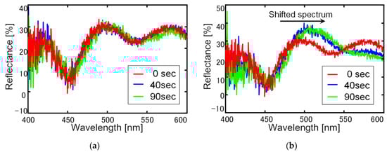 Change of the light reflection spectrum. (a) Sensor without parylene-AM and (b) sensor with parylene-AM.